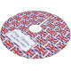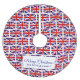 British Union Jack flag pattern custom Christmas tree skirt. Fun Holiday decorations with personalizable seasons greeting and family name. Add your own custom wishes like Merry Christmas or Happy Holidays! Novelty x-mas accessories and patterned home decor for the winter season. Elegant typography template. Home decor with flag of UK United Kingdom GB Great Britain. English Red white and blue colors. Elegant script typography template.