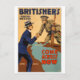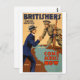 Restored and digitally enhanced vintage poster showing two men on a globe shaking hands across the Atlantic; a man in a suit reaches across from the United States to a soldier standing on Great Britain and France. Image courtesy of the Library of Congress. Published in 1917.