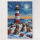 Bring happy, enthusiastic charm to your holiday season with this energetic Brittany Spaniel Christmas design! This magical scene features three handsome, athletic Brittany Spaniels sitting attentively at the base of a tall red-and-white lighthouse, which stands majestically on a snowy coastal cliff. The lighthouse is beautifully adorned with glowing Christmas lights and fragrant garlands. The dogs wear festive Santa hats and cozy scarves, surrounded by colorful wrapped gifts and cheerful holly branches. The ocean waves sparkle in the moonlight while soft snowflakes drift gently in the air, creating a truly magical winter holiday atmosphere. This design is a perfect Christmas gift for any Brittany Spaniel owner, dog lover, or admirer of festive and devoted sporting dog art, capturing the serene joy of the season.
