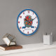 Knights style shield monogram letter B art name simple numbered wall clock in shades of red, golden yellow, blue white and gray. Personalize with your child's own name and name meaning for a personalized touch to your child's bedroom or nursery, this example is for names starting with the letter B. Currently reads Brodie King of muddy rampart. Formidable, spirited and brave. Ideal for a gift to a new baby boy, for a christening, baby naming or baby shower gift. Unique shield drawing, graphic art, name research, wording and design by Sarah Trett. www.sarahtrett.com for www.mylittleeden.com