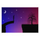 A drawing of a man standing silhouetted on a broken bridge, looking across the gulf where a lone willow tree stands. In the sky behind him are the moon and stars in a dark blue sky, fading to red on the far side for the beginning of the sunrise. An illustration of the emotions of hope, despair, and loneliness as he reaches the end of the road and finds the way impassable.