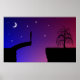 A drawing of a man standing silhouetted on a broken bridge, looking across the gulf where a lone willow tree stands. In the sky behind him are the moon and stars in a dark blue sky, fading to red on the far side for the beginning of the sunrise. An illustration of the emotions of hope, despair, and loneliness as he reaches the end of the road and finds the way impassable.