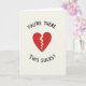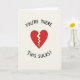 This greeting card shows a deep red broken heart in the center, split by a sharp zigzag crack. The background is a soft off-white, which makes the heart stand out right away. Above the heart, the text “YOU’RE THERE” is written in a hand-drawn script with slightly uneven strokes, like a quick note. Below the heart, “THIS SUCKS!” appears in the same handwritten style, a bit rough and direct, with an exclamation point that adds extra feeling. The letters look slightly tilted and not perfectly spaced, which makes the message feel personal and honest. Overall, it’s a simple design that speaks to heartbreak, disappointment, and the need for support, even on Valentine’s Day. ❤️💌🍫 Wishing you an easy way to share caring Valentine’s Day sentiments with someone who needs them.