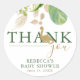 Made to match our elegant boho dinosaur theme, this sticker carries the theme of the card with a faux gold glitter dinosaur overlapping the work THANK with the word you in gold script underneath. Greenery in green and gold also adorns the top of the thank you sticker. Easily edit for your event, whether it's for a birthday or baby shower.