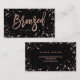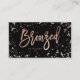 A modern, stylish spray tans bronzed business card with modern hand lettering style brush typography in faux rose gold foil on a rose gold confetti splatters with customizable black background.