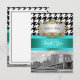 Customizable Invitations and accessories with a black and white East River skyline view New York City's iconic Brooklyn Bridge and Municipal Building with a boat passing by. It also features a black and white houndstooth pattern, a teal ribbon and a white label in your choice of a silver or gold look frame. (Note: some coordinating accessories may not have the above mentioned photo or additional design elements.)