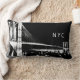 Modern lumbar pillow features a cool artistic sketch of New York City's Brooklyn Bridge with boats sailing underneath; a black and white design. "NYC" presented in stylish urban typography in the upper right hand corner.