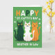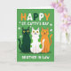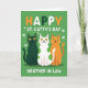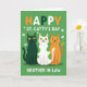 This greeting card shows three friendly cartoon cats sitting close together on a rich green background, their shoulders touching like they’re posing for a favorite photo 💚. One cat is dark forest green, the middle cat is white with green polka dots, and the third is a warm orange, echoing Irish-flag colors in a cozy, companionable way. Their wide yellow eyes and small smiles feel like an inside joke shared between pals, with the middle cat leaning in just enough to suggest easy affection. Across the upper area, the pun “ST. CATTY’S DAY” appears in rounded letters that alternate white, orange, and green, standing out clearly against the green field ☘️. Near the bottom, “BROTHER IN LAW” is set in all caps in white, centered and easy to spot. Small white shamrocks float around the cats, and tiny golden dots are sprinkled between them like confetti. The trio is centered on the front, framed by scattered shamrock shapes and gold specks across the green backdrop.