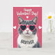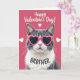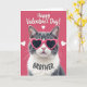 This greeting card shows a grey-and-white tuxedo cat centered on a bright fuchsia background. The cat faces forward with a calm, slightly funny expression, wearing bright pink heart-shaped sunglasses that make it feel extra loving ❤️. Its white whiskers spread out on both sides, and you can see a fluffy white chest and a small pink nose. Near the top, the text “Happy Valentine’s Day!” appears in white, flowing cursive-style letters, with three small white hearts floating nearby. Across the lower part of the cat’s white chest area, the word “BROTHER” is written in white, all-capital letters that stand out clearly. It feels meaningful because it mixes sweetness and a bit of humor while still saying “I care about you” in a direct way 🥰. It’s an easy, heartfelt way to share Valentine’s Day sentiments.