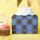 This bright pattern features a bright blue background with brown and navy blue squares. Inside each square is star shaped design.
