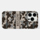 Customize this brown and gray camouflage iPhone 16 pro case with your name in a trendy modern CAP font in brown on taupe. It's masculine and perfect for your favorite military, hunting, country or outdoorsman!