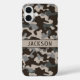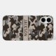 Customize this brown and gray camouflage iPhone 16 plus case with your name in a trendy modern CAP font in brown on taupe. It's masculine and perfect for your favorite military, hunting, country or outdoorsman!