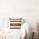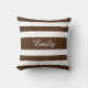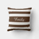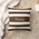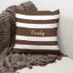 A stylish and unique throw pillow cushion with a brown and white striped pattern design and a customizable white name print on the front side.