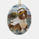Brown coated Australian Shepherd wearing white angel wings and a gold halo while laying in a field of wild flowers is featured on assorted ceramic ornaments for the Christmas season.
