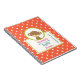 Baby shower spiral notebook. Designed with a cute baby monkey holding a pacifier in his mouth inside a circle with an olive green border. The background is an orange and white polka dot pattern. The letters in the word baby are hanging down from a boho style arrow.