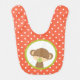 A baby bib with a cute baby monkey with a pacifier in his mouth Inside an olive green circle. The background is an orange and white polka dot pattern.