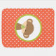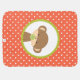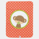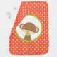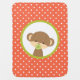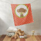 Baby blanket with a cute baby monkey with a pacifier in his mouth Inside a circle with an olive green border. The background is an orange and white polka dot pattern.