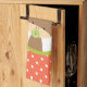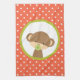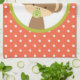 A kitchen towel with a cute baby monkey with a pacifier in his mouth Inside an olive green circle. The background is an orange and white polka dot pattern.