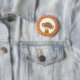 Button with a cute baby monkey with a pacifier in his mouth Inside an olive green circle. The background is an orange and white polka dot pattern.