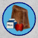 Patch design features an original illustration of a brown bag school lunch with an apple and carton of milk.