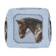 Portrait of a dark seal brown warmblood dressage and sport horse with an English riding style bridle. Original artwork by Crista S. Forest.