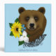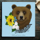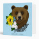This charming illustration features a close-up of a brown bear accented with a bright and cheerful arrangement of flowers. Set against a soft blue background, the rich brown tones of the bear contrast beautifully with a sunny yellow bloom, delicate white flower, and small blue flower. A decorative tribal art feather adds a subtle artistic flair, blending rustic woodland character with a hint of boho style. This unique design is perfect for nature lovers, wildlife enthusiasts, and anyone who appreciates bold yet whimsical animal art.