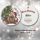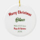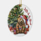 On the front of this Holiday ornament is an adorable brown bear wearing a red and white Santa hat. The bear sits in front of a decorated Holiday tree, and is wrapped in a string of festive lights. Red text at the side says "JOYFUL". On the back, red and green text says MERRY CHRISTMAS", and there are additional text fields for you to customize. Wonderful to give to a grandson, granddaughter, son, or daughter.
