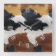 Wall clock design featuring an Image of brown, black, and white cowhide texture print.
