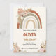 These adorable baby shower invitations feature trendy boho style and trendy handwritten script. A terracotta and neutral cute painted rainbow is decorated with orange and peach watercolor flowers on a simple white background.
