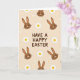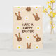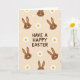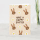 This card features a soft beige background filled with a repeating pattern of long-eared bunny faces and small spring flowers 🌷. Centered on the front, the phrase “HAVE A HAPPY EASTER” sits as the main focus in rounded, chocolate-brown lettering. Around the text, the bunny heads are drawn in warm brown with tiny dot eyes, curved smiles, and fine whisker lines, giving them a sweet, friendly look that feels like a shared inside joke between close friends 🐰. Each bunny has tall upright ears, a bright white nose, and simple facial details that keep the design easy to take in. Scattered between the bunnies, white daisies with sunny yellow centers add light contrast and a gentle, affectionate touch to the scene. The pattern feels evenly spaced, so your eyes move from the central words out to the repeating faces and flowers without any harsh edges. White daisy petals and yellow centers sit against the creamy beige field, nestled between the brown bunny faces and their long ears.