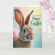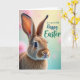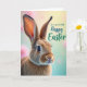This card features a close-up of a rabbit-like creature 🐇, shown from the left toward the center with its head slightly tilted as if leaning in for a gentle, friendly moment. Its fur is layered in warm browns with visible strands and soft shading that makes it look touchable. Large deep-blue eyes look outward with a tender, curious gaze, framed by fine lashes that add a sweet, affectionate look. Soft light seems to come from within the scene, turning the inner ears a warm peachy orange and giving the face a calm glow. Behind it, the background melts into a springlike blur of pale yellow, soft pink, and light teal 🌷, keeping attention on the animal’s expression. On the right side, the greeting text reads “for a special child Happy Easter,” set in a flowing style and colored in a medium gray that stands out gently against the pastel backdrop. A small pink nose sits near the lower center with thin whiskers fanning outward in delicate lines. The pastel background fades smoothly around the text area, with the teal tones most noticeable along the right edge.