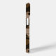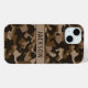 Customize this multi-hued brown camouflage iPhone 15 case with your name in a trendy modern CAP font in dark brown on light brown. It's masculine and perfect for your favorite military, hunting, country or outdoorsman!