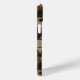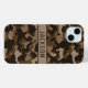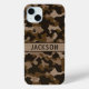 Customize this multi-hued brown camouflage iPhone 15 plus case with your name in a trendy modern CAP font in dark brown on light brown. It's masculine and perfect for your favorite military, hunting, country or outdoorsman!