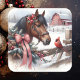 Farming themed Christmas stickers with a pretty brown horse with a red bow and a pretty red cardinal on the fence with a rustic barn in the background of a snowy winter day watercolor ai art.