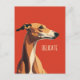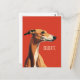 This is a minimalist postcard design featuring a brown greyhound illustration against vivid red background and a customizable text "delicate".