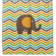 Shower curtain featuring a brown elephant with orange ears on a chevron stripe background of orange, brown, blue, green, and white.