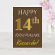This simple, personalized wedding anniversary greeting card design features the message "HAPPY 14th ANNIVERSARY", with the "14th" having a faux gold-like appearance. The front also features a personalized name, and a brown colored background. The inside features a custom wedding anniversary greeting message. It could be given to a husband or a wife in celebration of the couple’s fourteenth wedding anniversary. [~Z0000090]