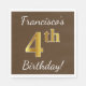 This simple paper napkin design features a message like "Francisco’s 4th Birthday!", with the "4th" having a faux gold-like appearance, on a brown colored background. The name can be personalized. It could be used at a birthday party for somebody who is celebrating their fourth birthday. [~Z0000082]
