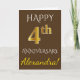 This simple, personalized wedding anniversary greeting card design features the message "HAPPY 4th ANNIVERSARY", with the "4th" having a faux gold-like appearance. The front also features a personalized name, and a brown colored background. The inside features a custom wedding anniversary greeting message. It could be given to a husband or a wife in celebration of the couple’s fourth wedding anniversary. [~Z0000090]