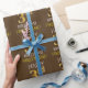 This wrapping paper design features a message like "HAPPY 3rd BIRTHDAY", with the "3rd" having a faux/imitation gold appearance. It also features a name that can be personalized, and a brown colored background. It could perhaps be used when wrapping gifts being given for somebody’s third birthday. [~Z0000133]