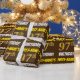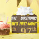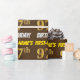 This wrapping paper design features a message like "FIRST-NAME’S 97th BIRTHDAY!", with the "97th" having a faux/imitation gold-like color appearance, and with the name and "BIRTHDAY" in a fun, bold font. The name can be customized, and the background is colored brown. Wrapping paper like this could perhaps be used when wrapping birthday gifts being given to somebody in celebration of their ninety seventh birthday. [~Z0000211]