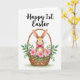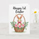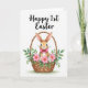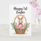 This card features a sweet long-eared bunny in warm brown tones, looking straight ahead from inside a woven wicker basket 🐰. Subtle fur texture and a gentle smile give the bunny a friendly, affectionate look, topped with a neatly tied pink bow that adds a soft touch. Around the bunny, spring flowers fill the basket like a caring embrace, mixing pink blossoms with yellow centers and small white blooms among leafy green sprigs 🌷. The basket is shaded in rich browns with visible weave lines, creating a cozy, rustic setting that feels like a shared little moment. Near the top, the text “Happy 1st Easter” is placed above the illustration in flowing black lettering, standing out clearly against the white background. The open white space keeps the focus on the bunny and flowers while making the pastel accents feel gentle and airy. Pink petals and green leaves cluster around the basket’s rim, with the bow centered just below the bunny’s face.