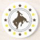 This drink coaster features a dark brown cowboy and bucking horse silhouette image. The image is circled by a frame of black dots and double lines. The entire image is then framed by alternating matching brown and bright gold stars. *This design uses image © Graphics Factory.com*