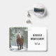 Name badge with a photograph of a brown horse with a long white scruffy mane. Standing in a forest with snowflakes falling all around.