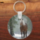 A keychain with a photograph of a brown horse with a long white scruffy mane. Standing in a forest with snowflakes falling all around.