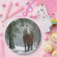 Paper plates with a photograph of a brown horse with a long white scruffy mane. Standing in a forest with snowflakes falling all around.