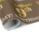 This wrapping paper design features a message like "FirstName’s 9th BIRTHDAY!", with the "9th" having a faux/imitation gold-like color appearance. The name can be personalized, and the background is colored brown. It could perhaps be used when wrapping gifts being given for somebody’s ninth birthday. [~Z0000180]