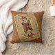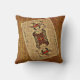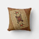 A brown throw pillow with a cool joker playing card design on it. The jester is wearing brown clothes with white and black square pattern on the arms and hat. Red belt, buttons and detail on the hat. She is throwing the ace cards up in the air.