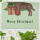 Destei's original cartoon illustration of a cute chocolate brown color Labrador Retriever breed dog. The dog is standing by a festive Christmas tree decorated with red and yellow ornaments, a white pearl garland and a yellow star that is placed on the top of the tree. There are also two wrapped presents by the tree and behind the dog there is a brown shelf with two candles. The background color is light green and there is also a personalizable text area that now reads: "Merry Christmas!".