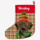 Red and green plaid for a seasonal feel on this two-sided Christmas stocking has a watercolor illustration of an adorable Chocolate Lab and your pup's name on both sides.